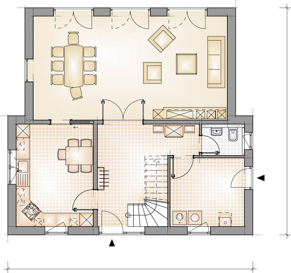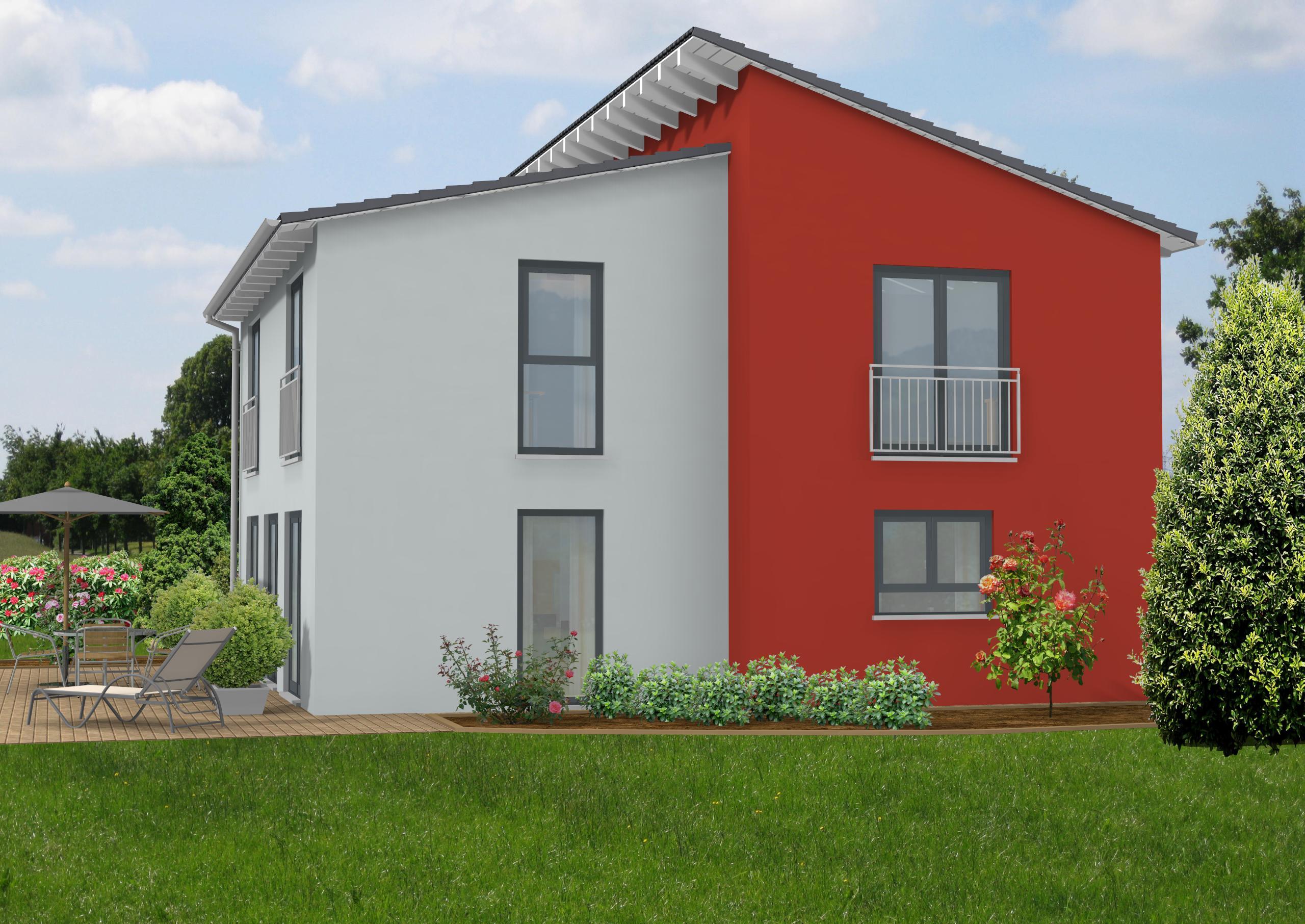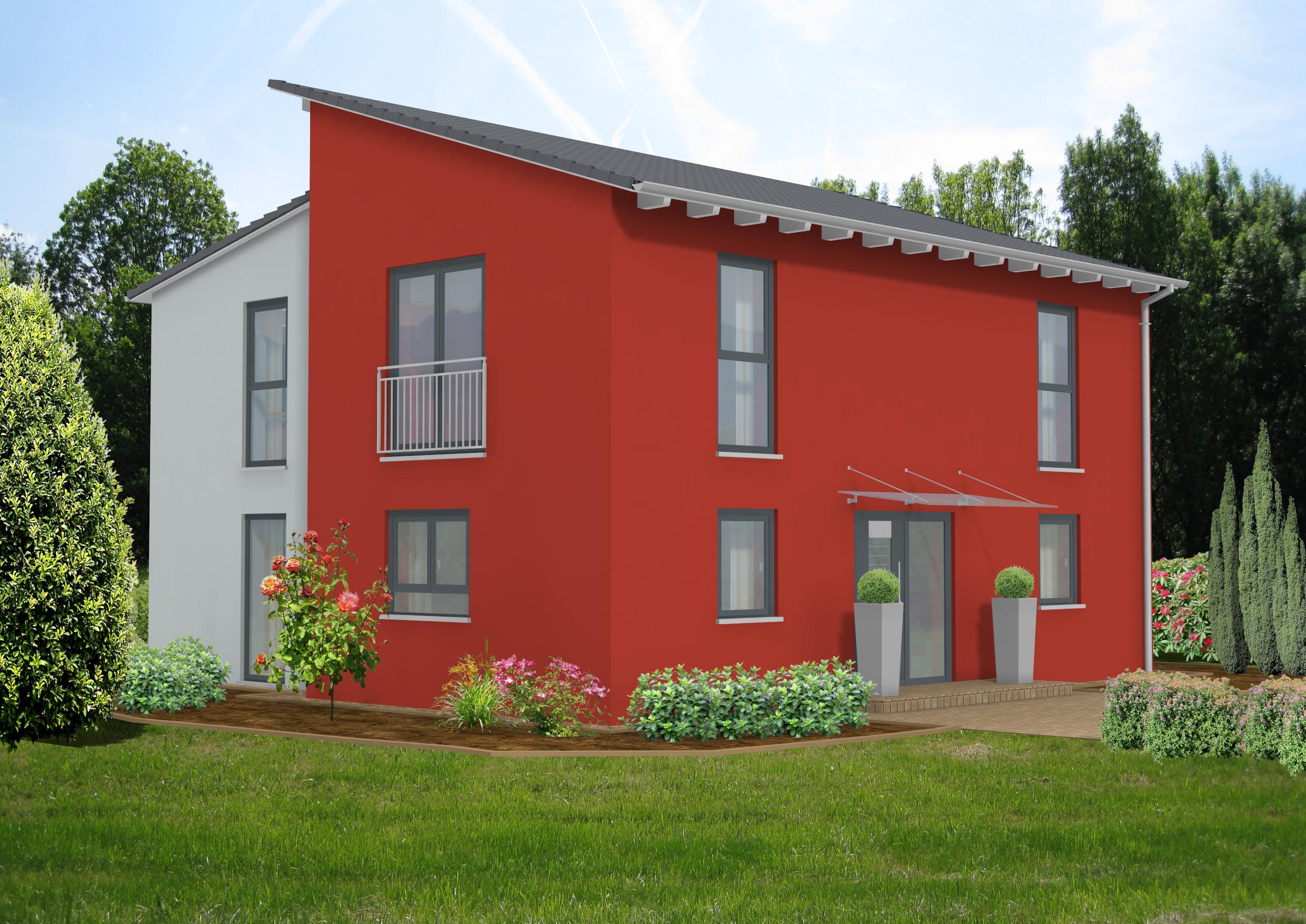 Dieses kompakte Einfamilienhaus ist schlicht, hat aber durch das versetzte Pultdach seine eigene Note. Hier gibt es reichlich Platz, und die hohen Fenster lassen jede Menge Licht herein. Vom großzügigen Wohnzimmer gelangt man direkt hinaus auf die Terrasse. Ein Haus für moderne Menschen mit Stil.